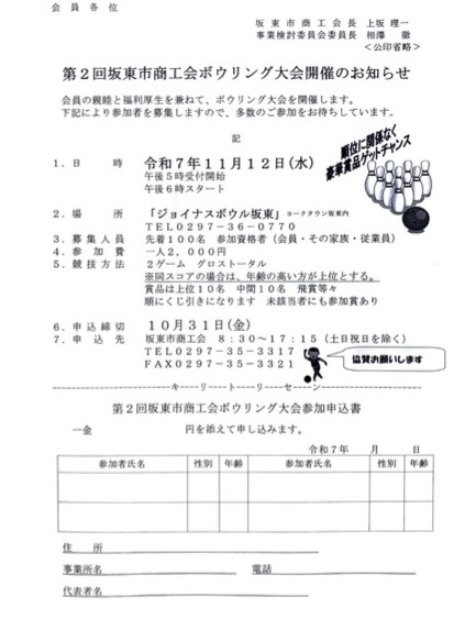 第2回坂東市商工会ボウリング大会締切延長のお知らせ 2025年10月24日2025年10月24日 ( 閲覧6 ) 第2回坂東市商工会ボウリング大会ですが若干の空きがございますので締切を10月31日(金)まで延長いたします。 定員まであと20名ですのでお早めにお申し込みください。